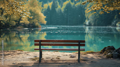 © marishatti, Obraz premium Serene Lake View with Empty Bench in Foreground
