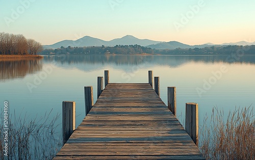 © Tri, Fototapeta premium Serene lake view with wooden dock at sunrise.