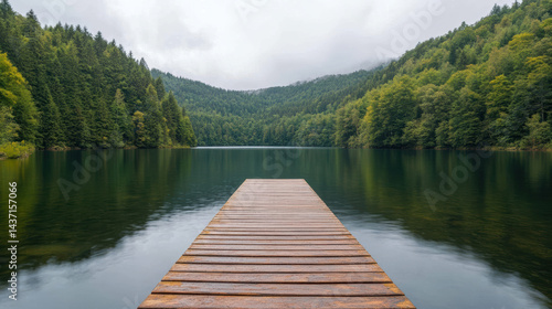© siraphol, Fototapeta premium Serene lake view with wooden dock surrounded by lush green forests and mountains