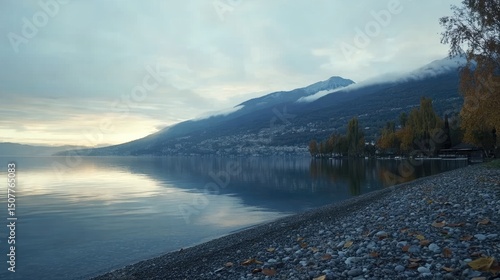 © 1989, Obraz premium Serene lake vista at sunrise with pebble beach.