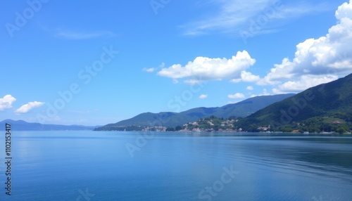 © AnggunArtworks, Naklejka premium Serene lake vista with mountains and clouds.