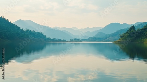 © Bebek, Fototapeta premium Serene lake with a mountainous backdrop and a hazy atmosphere.
