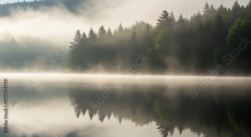© Zimy, Fototapeta premium Serene Lake with Misty Forest Background Blur