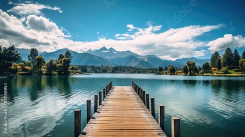 © Meow Creations, Fototapeta premium Serene Lake with Mountain View and Wooden Pier, Tranquil Landscape