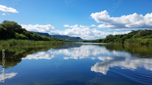 Fototapeta premium Serene Lake with Reflective Water and Idyllic Landscape under Clear Blue...
