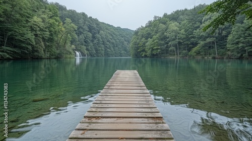 © Arifin Studio, Naklejka premium Serene lake with wooden dock, lush green forest background.