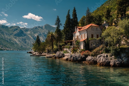 © Alona, Fototapeta premium Serene Lakefront Haven: A Picturesque House Overlooking Montenegro's Tranquil Waters