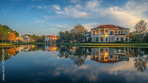 © lander, Fototapeta premium Serene Lakefront View of Contemporary Homes