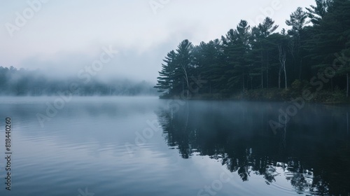 Fototapeta premium Serene lakeside at dawn with mist hovering over the water