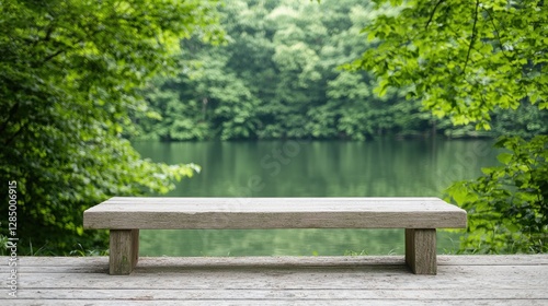 Fototapeta premium Serene lakeside bench, nature view, peaceful rest