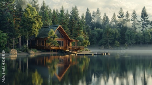 © Denys, Fototapeta premium Serene lakeside cabin at dusk