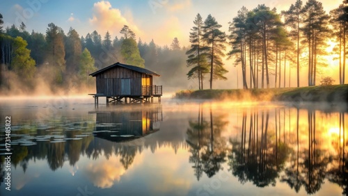© Urenus Photos, Fototapeta premium Serene Lakeside Cabin at Sunrise, Misty Morning Reflections on Calm Water