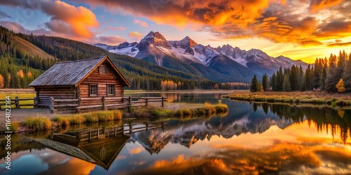 Naklejka premium Serene Lakeside Cabin at Sunset with Majestic Mountain Reflection