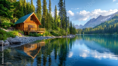 Fototapeta premium Serene lakeside cabin, bright sunny day, crystal clear water, perfect reflection, lush pine forest, vibrant green foliage, wooden log house, tranquil atmosphere, panoramic view, landscape.