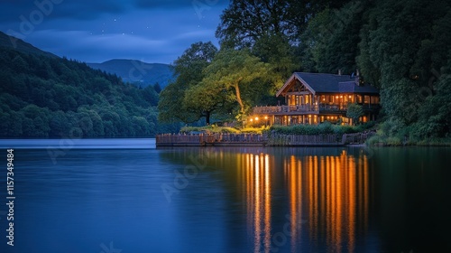Fototapeta premium Serene lakeside cabin glowing in evening light, surrounded by trees and calm...