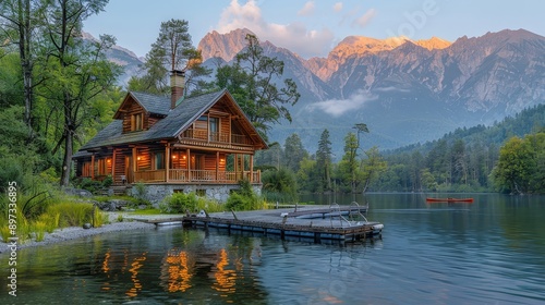 © Nice Seven, Fototapeta premium Serene Lakeside Cabin in the Majestic Mountains