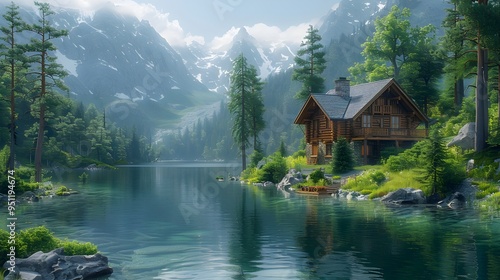 Fototapeta premium Serene Lakeside Cabin Nestled in Lush Mountain Greenery,Tranquil Nature Retreat