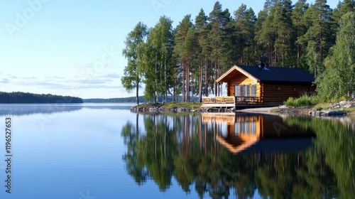 © Imam, Fototapeta premium Serene lakeside cabin surrounded by lush trees and calm waters.