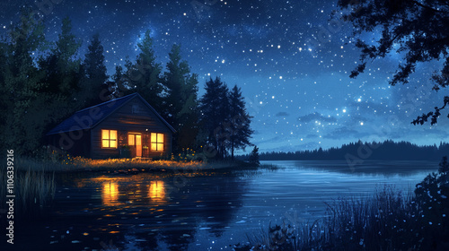 Fototapeta premium Serene Lakeside Cabin Under Starry Night Sky Peaceful Night Nature Scene