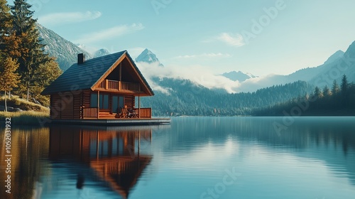 © Damen, Fototapeta premium Serene Lakeside Cabin with Majestic Mountain Backdrop