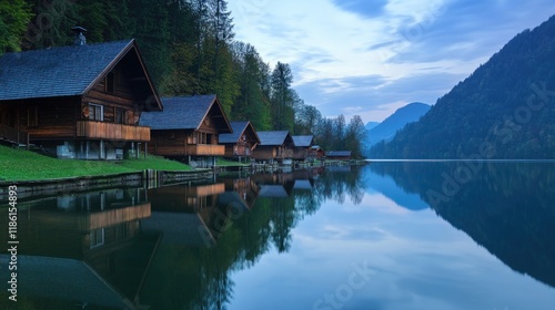 Naklejka premium Serene Lakeside Cabins at Dawn