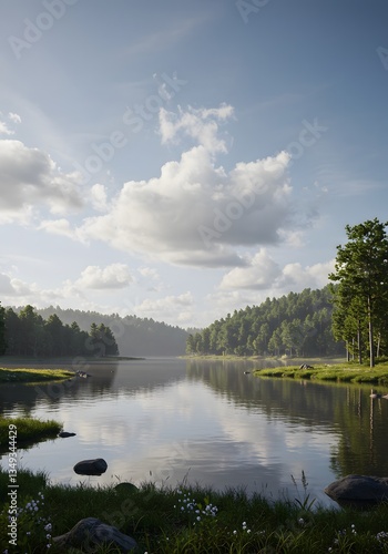 © remember, Obraz premium Serene Lakeside Forest Calm Water Lush Greenery Summer Sky