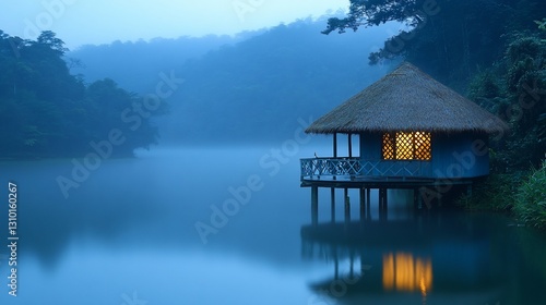 © ngamaz, Fototapeta premium Serene lakeside hut at twilight