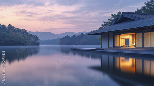 © Thanthara, Fototapeta premium serene lakeside Japanese house with engawa deck at sunset