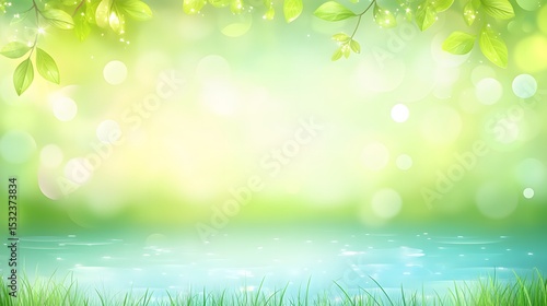© Fozle, Obraz premium Serene Lakeside Nature Scene Green Leaves Bokeh Background