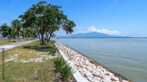 © Indatul, Naklejka premium Serene lakeside path with mountain view