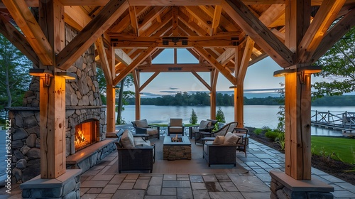 Fototapeta premium serene lakeside pavilion with open wooden beams, a stone fireplace, and cozy...