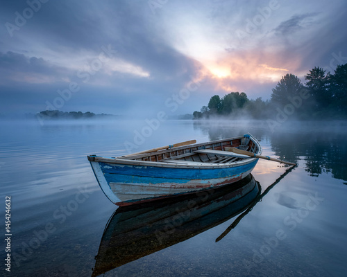© MdSahid, Fototapeta premium Serene Lakeside Scene Of A Rowboat Floating On Misty Water At Sunset