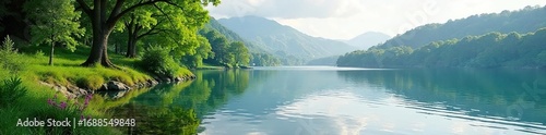 Fototapeta premium Serene lakeside scene, perfect for relaxation and escape Tranquil water, lush greenery, and peaceful atmosphere ideal for leisure time Enjoy the calm and quiet of nature , healing, getaway, serene