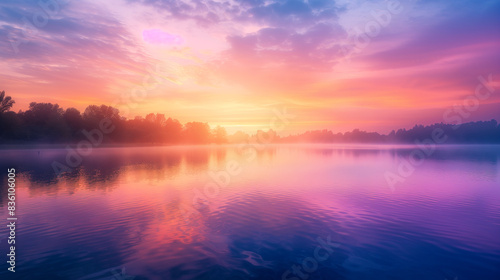 © Kevin, Fototapeta premium Serene Lakeside Sunrise, Generative Ai