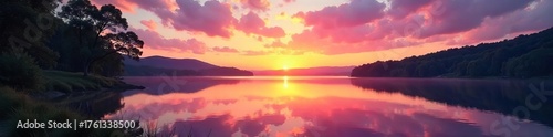 © Lertchai, Fototapeta premium Serene Lakeside Sunset Tranquil Water Reflects Vibrant Sky, Perfect for Relaxation and Unwinding