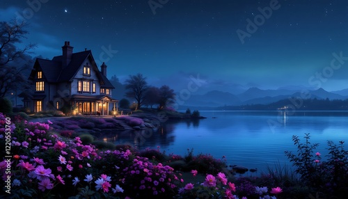 © Morits Art, Fototapeta premium Serene Lakeside Victorian House Night Scene Vibrant Flowers Dark Blue Sky