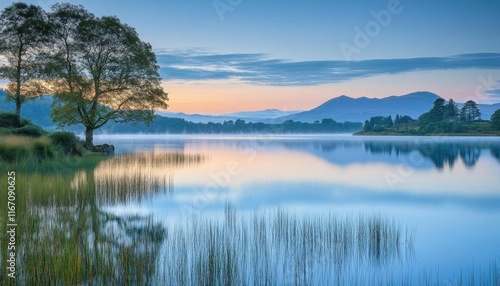 © Light, Fototapeta premium Serene lakeside view at dawn with mountains in the background.