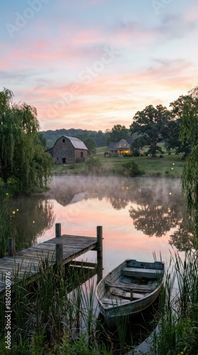 © Kitta Studio, Fototapeta premium Serene Lakeside View with Barn and Boat at Dawn