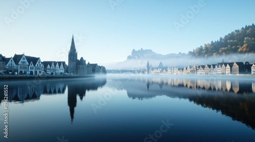 © Fadil, Fototapeta premium Serene lakeside view with reflections and misty morning atmosphere.