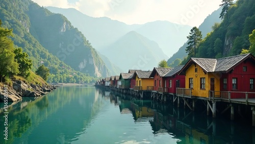 © Bh_19, Fototapeta premium Serene Lakeside Village Nestled Among Majestic Mountains, Featuring Vibrant Colorful Houses on Stilts Reflecting in Calm Waters