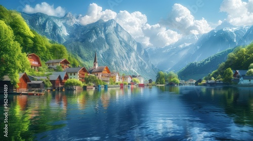 Fototapeta premium Serene lakeside village surrounded by mountains and lush greenery under a...