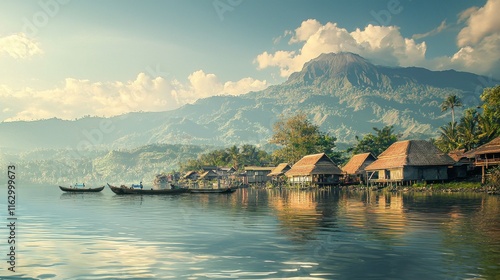 © wisnuromad art, Naklejka premium Serene lakeside village with mountains in the background.