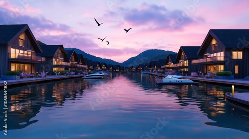 © A4719, Fototapeta premium Serene Lakeside Villas at Sunset Luxury Waterfront Homes
