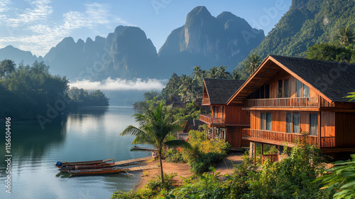 © Asim-Backgrounds, Fototapeta premium serene lakeside wooden retreat surrounded by lush mountains