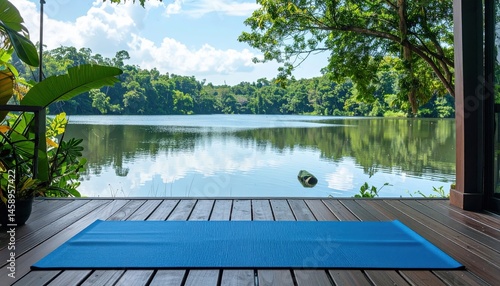 © mankong, Obraz premium Serene Lakeside Yoga Blue Mat on Wooden Deck Overlooking Tranquil Water and Lush Greenery