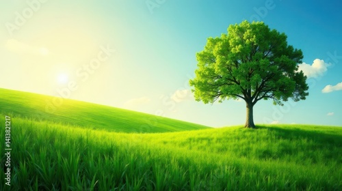 © Prakaikan, Fototapeta premium Serene Landscape A Single Tree Stands Tall on a Gently Rolling Hill Amidst a Vibrant Green Meadow Under a Sunny Sky