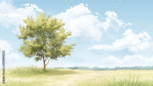 © tawat, Obraz premium Serene landscape, a solitary tree in vast field under vibrant blue sky