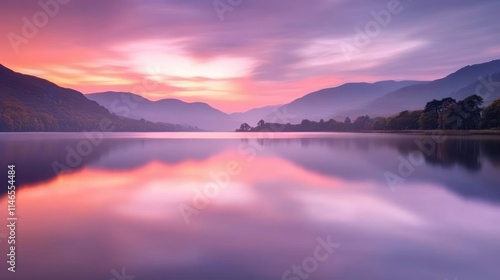 © yoga, Fototapeta premium Serene landscape at dawn with mountains reflecting in calm water.