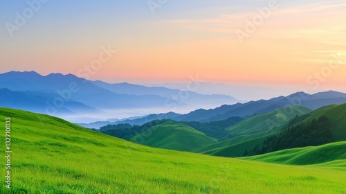 Obraz premium Serene landscape at dawn with rolling green hills and distant mountains under...