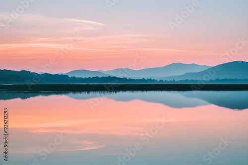 Fototapeta premium Serene Landscape at Dusk Reflecting Tranquil Waters and Mountain Silhouettes,...